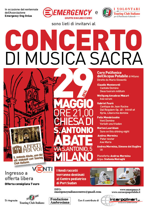 Per festeggiare il ventesimo compleanno di Emergency, giovedì 29 Maggio siete tutti e tutte invitati al concerto che eseguiremo alla chiesa di S. Antonio Abate, in via S. Antonio 5 a Milano.